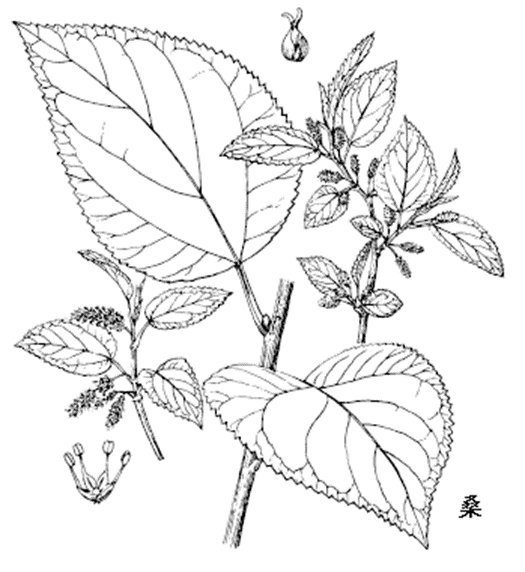 桑落叶灌木或小乔木,高3-15m。树皮灰白色,有条状浅裂;根皮黄棕色或红黄色,纤维性强。单叶互生;叶柄长1-2.5cm;叶片卵形或宽卵形,长5-20cm,宽4-10cm,先端锐尖或渐尖,基部圆形或近心形,边缘有粗锯齿或圆齿,有时有不规则的分裂,上面无毛,有光泽,下面脉上有短毛,腋间有毛,基出脉3条与细脉交织成网状,背面较明显;托叶披针形,早落。花单性,雌雄异株;雌、雄花序均排列成穗状葇荑花序,腋生;雌花序长1-2cm,被毛,总花梗长5-10mm;雄花序长1-2.5cm,下垂,略被细毛;雄花具花被片4,雄蕊4,中央有不育的雌蕊;雌花具花被片4,基部合生,柱头2裂。瘦果,多数密集成一卵圆形或长圆形的聚合果,长1-2.5cm,初时绿色,成熟后变肉质、黑紫色或红色。种子小。花期4-5月,果期5-6月。 |