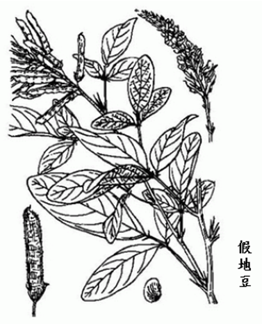 假地豆属半灌木或小灌木,高1-3m。嫩枝疏生长柔毛。叶柄长约2cm,具柔毛;托叶披针形,长约7mm。三出复叶,顶生小叶较大,椭圆形至宽倒卵形,长2.5-6cm,宽1.3-2.5cm,上面无毛,下面有白色长柔毛,侧生小叶较小;圆锥花序腋生,花序轴有开展的淡黄色长柔毛;花萼宽钟状,萼齿宽披针形,短于萼筒或等长;花冠紫色,长约5mm,雄蕊10,单体;子房线状,被毛。荚果长12-25mm,宽约3mm,有4-9荚节,具小钩状毛,腹缝线直,背缝线波状。花期8-9月,果期9-11月。 |