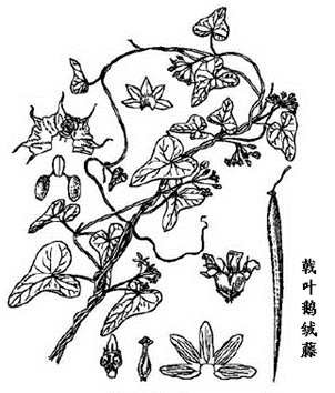 戟叶鹅绒藤属多年生缠绕藤本。根粗壮,圆柱状,土灰色,径约2cm。叶对生;有长柄;叶片纸质,戟形或戟状心形,长4-6cm,基部宽3-4.5cm,向端部长渐尖,基部具2个长圆状平行或略为叉开的叶耳,两面均被柔毛,脉上与叶缘被毛略密。伞房状聚伞花序腋生,花序梗长3-5cm;花萼外面被柔毛,内部腺体极小;花冠外面白色,内面紫色,裂片长圆形,长约4mm,宽1.3mm;副花冠双轮,外轮筒状,其先端具有5条不同长短的丝状舌片,内轮5条裂较短;花粉块长圆状,下垂;子房平滑,柱头隆起,先端微2裂。蓇葖单生,狭披针形,长约10cm,直径约1cm。种子长圆形,长约5mm;种毛白色绢质,长达2cm。花期5-8月,果期6-10月。 |
