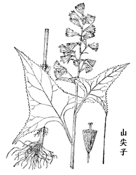 山尖子属多年生草本,高60-150cm。茎粗壮,上部密被腺状短柔毛。下部叶花期枯萎,中部叶三角状戟形,长10-17cm,宽13-19cm,基部截形或微心形,楔状下延或上部有狭翅的叶柄,叶柄长4-5cm,边缘有不规则的尖齿,上面有疏柔毛,下面毛较密,上部叶渐小,三角形或常圆形。头状花序多数,下垂,密集成塔形的圆锥花序,花序梗长0.4-2cm,密生腺状短毛;总苞筒状,长9-12mm;总苞片8个,狭长圆形或披针形,密生腺状短毛;花13-19个,筒状,淡白色。瘦果淡黄褐色,冠毛白色。 |