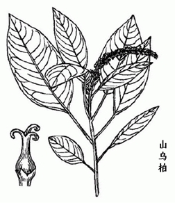 山乌柏属落叶乔木或灌木,高达10m。小枝灰褐色,有点状皮孔。叶互生;叶柄长2-7.5cm,顶端有腺体2;叶片纸质,椭圆状卵形,长3-10cm,宽2-5cm,全缘,下面粉绿色;侧脉8~12对。穗状花序顶生,长4-9cm;单性,雌雄同序,无花瓣及花盘;雄花花萼杯状,先端不整齐齿状裂,雄蕊2,极少3;雌花生在花序的近基部,萼片3,三角形,子房卵形,3室,花柱3,基部合生。蒴果球形,黑色,直径1-1.5cm;种子近球形,长4-5mm,直径3-4mm,外被蜡层。花期4-6月,果期6-12月。 |