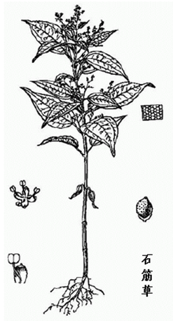 石筋草为荨麻科植物石筋草的全草或根。 石筋草属多年生草本,高15-30cm。无毛,茎肉质,基部匍匐,节上生根,上部被白粉。叶对生,不等大;叶柄长1.5-4cm;托叶三角形,纸质;叶片狭卵形或卵形,长1.2-12cm,宽0.7-4.5cm,先端渐尖或长渐尖,基部圆形,稍斜,全缘,上面深绿色,下面淡绿色,钟乳体密生,狭条形;基出脉3条。雌雄异株,稀雌雄同株;聚伞花序腋生,有细梗,长约2.5cm;雄花直径约1.4-1.6mm,花被片4,狭倒卵形,雄蕊4,与花被片对生;雌花花被片3,不等大,长达0.3mm,柱头画笔头状。瘦果卵形,长约0.8mm,两侧压扁,淡棕色,有小瘤体。花期5-9月,果期7-10月。 |