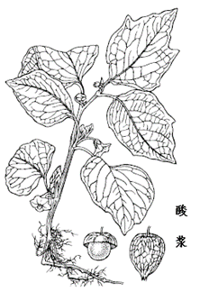酸浆为茄科植物酸浆及挂金灯的全草。茎圆柱形,木质化较硬。叶互生,完整的叶片阔卵形,长5-15cm,宽2-8cm,先端尖,基部不对称,波状缘有粗齿。宿萼卵球形,直径1.5-2.5cm,黄绿色,薄纸质。浆果圆球形,皱缩,直径1-1.2cm。气微,味苦。