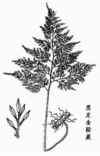 黑足金粉蕨属陆生蕨类植物,植株高50-90cm。根茎横走,疏被深棕色披针形鳞片。叶薄革质,近生或远生,一型,偶为二型;叶柄长20-50cm,基部黑色,略被鳞片,向上为禾秆色;叶片卵状长圆形或阔卵形,长20-40cm,渐尖头,五回羽状细裂;羽片10-14对,卵状长圆形,互生,基部1对最大,长10-25cm,宽5-14cm,柄长约lcm,四回羽状细裂;末回孢子叶裂片倒卵形,较宽;营养叶裂片较狭,先端常锐二裂;叶脉二叉分枝,营养叶裂片有小脉1条。孢子囊群短线形,长2-4mm,生于小脉先端的连接脉上;囊群盖灰白色,全缘,宽达主脉。 |