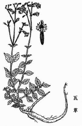 瓦草为石竹科植物瓦草的根。根条长圆锥形,有时分枝,直径3-12mm,长达30cm,芦头明显。表面黄白色或棕黄色,具横形的皮孔及纵皱。质坚脆,易折断;断面不整齐,显蜡质,外轮皮层黄白色,木部淡黄色。气微,味苦、微麻。 瓦草属多年生草本,斜卧,高约50cm。根圆锥形,肉质肥厚。茎中空,具膨大的节,被有短柔毛及腺毛。叶对生;无柄;叶片椭圆形或椭圆状卵形,长4-5cm,宽2-3cm,先端锐尖,基部楔形,边缘微呈波状,两面具乳及短柔毛。二歧聚伞花序顶生;萼筒绿色,密被腺毛,先端5裂;花瓣5,淡红色,匙状倒披针形,喉部具副花冠,鳞片2深裂;雄蕊10,花丝吐露,花药白色,丁字着生;子房上位,花柱3枚,分生。蒴果圆锥形,1室。种子肾形,棕色。花期6-9月,果期9-10月。 |