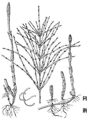 问荆为木贼科植物问荆的全草。全草长约30cm,多干缩或枝节脱落。茎略扁圆形或圆形,淡绿色,有细纵沟,节间长,每节有退化的鳞片叶,鞘状,先端齿裂,硬膜质。小枝轮生,梢部渐细。基部有时带有部分根,呈黑褐色。气微,味稍苦涩。 问荆属多年生草本,根茎横走,匍匐生根,黑色或暗黑色,节和根密生黄棕色长毛。地上茎直立,二型;营养茎在孢子茎枯萎后生出,高达15-40cm。有棱脊6-15条,沟中气孔带2-4行,节上轮生小枝,小枝实心,有棱脊3-4条。叶退化,下部联合成鞘,鞘筒狭长,鞘齿三角形,棕黑色,边缘灰白色,膜质,宿存。孢子茎早春自根茎生出,常为紫褐色,肉质,不分枝,高5-25cm,直径3-4mm,有12-14条不明显的棱脊;鞘筒漏斗状,鞘齿棕褐色,每2-3齿连接成三角形;先端生有长圆形的孢子囊穗,长1.8-4cm,有总梗,钝头,成熟时柄伸长;孢子叶六角形,盾状着生,螺旋排列,边缘着生6-7个长圆形孢子囊。孢子囊熟时孢子茎即枯萎;孢子圆球形,附生弹丝4条。 |