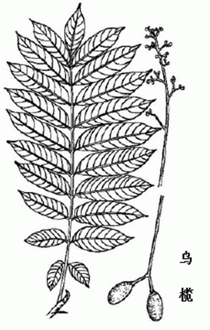 乌榄属常绿大乔木,高10-16m。有胶粘性芳香的树脂。树皮灰褐色,平滑;小枝褐绿色,无毛。奇数羽状复叶互生,长30-65cm;小叶15-21枚,革质,长圆形至卵状椭圆形,长5-15cm,宽3.5-7cm,先端渐尖或锐尖,基部偏斜,全缘,上面有光泽,无毛,下面平滑;网脉两面均明显。花两性或单性花与两性花共存;花序腋生,为疏散的聚伞圆锥花序,长于复叶;萼杯状,3-5裂,在雄花中长约2.5mm,在雌花中长3.5-4mm;花瓣在雌花中长约8mm;雄蕊6,着生于花盘边缘,长不超过花冠;雌蕊无毛,在雄花中不存在,子房上位,通常3室。核果卵形至椭圆形,略呈三角形,长3.5-4.5cm,宽1.5-2cm,成熟时紫黑色,表面平滑,核木质,两端钝,内有种子1-2颗;不育室适度退化。花期4-5月,果期5-11月。 |
