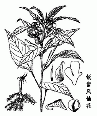 锐齿凤仙花属一年生草本,高30-70cm。茎坚硬,直立,分枝。叶互生;叶柄长1-4cm,基部有2个具柄腺体;叶片卵形或卵状披针形,长4-15cm,宽2-4.5cm,先端急尖或渐尖,基部楔形,两面无毛,边缘有锐锯齿;侧脉7-8对。总花梗极短,腋生,花1-2朵,花梗细长,基部有2刚毛状苞片;花大,粉红色或紫红色;萼片4,外面2个半卵形,长突尖,内面2个狭披针形;旗瓣圆形,背面中肋有狭龙骨状突起,先端具小突尖,翼瓣无柄,2裂,基部裂片宽长圆形,上部裂片大,斧形,先端2浅裂,背面有明显的小耳,唇瓣囊状,基部延长成内弯的短距;雄蕊5,花药钝。蒴果纺锤形,先端喙尖。种子少数,圆球形,稍有光泽。花期7-9月,果期6-10月。 |