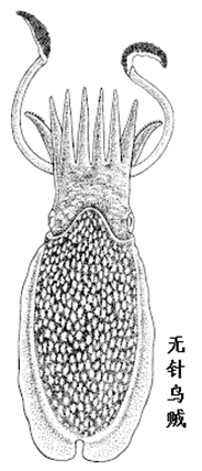 乌鱼蛋为乌贼科动物无针乌贼和金乌贼等的缠卵腺。 1.无针乌贼的软体中等大,背腹扁,胴部卵圆形,一般长约157mm,约为宽的2倍。头部长约29mm,眼大,眼后有椭圆形的嗅觉陷,头部中央有口,口的周围有腕4对和触腕1对。各腕长度相近,顺序为4>1>3>2,内侧有吸盘4行,吸盘大小相似,吸盘腔壁上的角质环外缘具尖锥形小齿;惟雄性左侧第4腕茎化为生殖腕,特点是基部约占全腕1/3处的吸盘特小,中部和顶部吸盘正常。触腕长度一般超过胴长,触腕穗狭小,长约40mm,其上有吸盘20行,大小相近,其角质环外缘具方圆形小齿。头部的腹面有一漏斗器。漏斗管下方体内与墨囊相通,可由漏斗排出墨液御敌。生活时,胴背有明显的白花斑,雄者斑大,雌者斑小。胴部两侧有肉鳍,全缘,前端较狭,向后渐宽,左、右两鳍在末端分离。胴后腹面末端有一腺孔,捕获后常有红褐色液体流出。外套腔背面的内壳长椭圆形,长约为宽的3倍,角质缘发达,末端形成角质板,横纹面呈水波形,末端无骨针。
