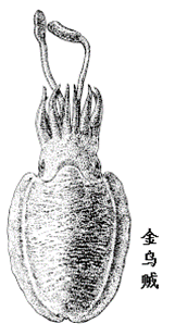 栖息于海底,每年春、夏季之际,从越冬的深处向岛屿附近浅水处洄游。产卵适温为16-19,卵多产在海藻丛中,有黑色胶膜包被,葡萄状,长径6-7mm,经月余孵出的稚仔,背斑明显,活动性强。肉食性,以甲壳类及小鱼为食。我国分布于南北沿海,以浙江、福建产量最大。 2.金乌贼的体中等大,胴部卵圆形,一般长约200mm,约为宽的1.5倍,头部长约30mm,腕序为4>1>3>2,吸盘4行,其角质环外缘具不规则的钝形小齿,雄性左侧第4腕茎化为生殖腕,特点是基部7列、8列吸盘正常,至9-15列吸盘突然变小,向上的吸盘又正常。触腕略超过胴长,触腕穗呈半月形,约为全腕长度的1/5。吸盘小而密,约10行,大小相近。生活时体表黄褐色,胴背具棕紫色和乳白色相间的细斑,雄性胴背具金黄色的波状横纹,但在生殖季节常显出若干不规则的蓝绿色横纹,腹部由乳白色变成金绿色,非常鲜艳。内壳长椭圆形,长约为宽的2.5倍,背面凸,有坚硬的石灰质粒状突起,腹面石灰质松软,中央有一条纵沟,横纹面具环形生长的横纹。末端骨针粗壮。