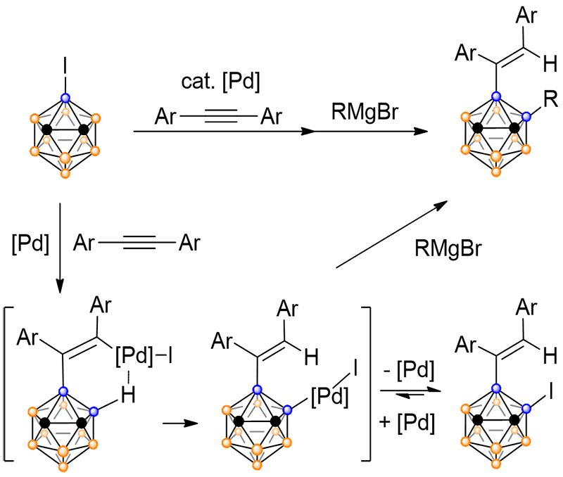 谢作伟课题组而利用碳硼烷分子上特殊的电性分布,促进金属在碳硼烷笼上的迁移。利用B(3)–I键引发反应,通过炔烃插入、钯迁移及与亲核试剂偶联,发展了一锅法的碳硼烷双官能团化方法。本工作所发展的方法可以通过钯迁移实现一锅法合成含有两个不同取代基的碳硼烷化合物(Angew. Chem. Int. Ed. 2020, 59, 4851)。