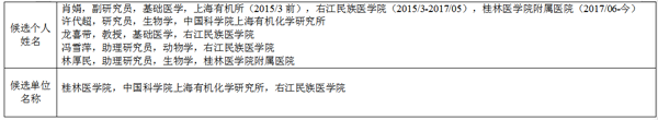 根据《广西科学技术奖励委员会办公室关于组织开展2022年度广西科学技术奖提名工作的通知(桂科奖字〔2022〕15号)》要求,现将我所为第二完成单位,申报2022年度广西科学技术奖(自然科学奖)项目“Vps34复合物的调节及在急性胰腺炎中的作用”相关内容,在“中国科学院上海有机化学研究所”网站上予以公示,公示日期为2022年7月4-10日。公示期间如有异议,请署真实姓名并以书面形式于公示结束之前反映到桂林医学院科技处,联系地址:桂林市临桂区致远路1号桂林医学院临桂校区明德楼305室,联系电话:0773-5302269。异议也可在公示期内以书面形式向中国科学院上海有机化学研究所科研处提出,联系人:李蓉,联系电话:021-54925225,Email:lrr@sioc.ac.cn。