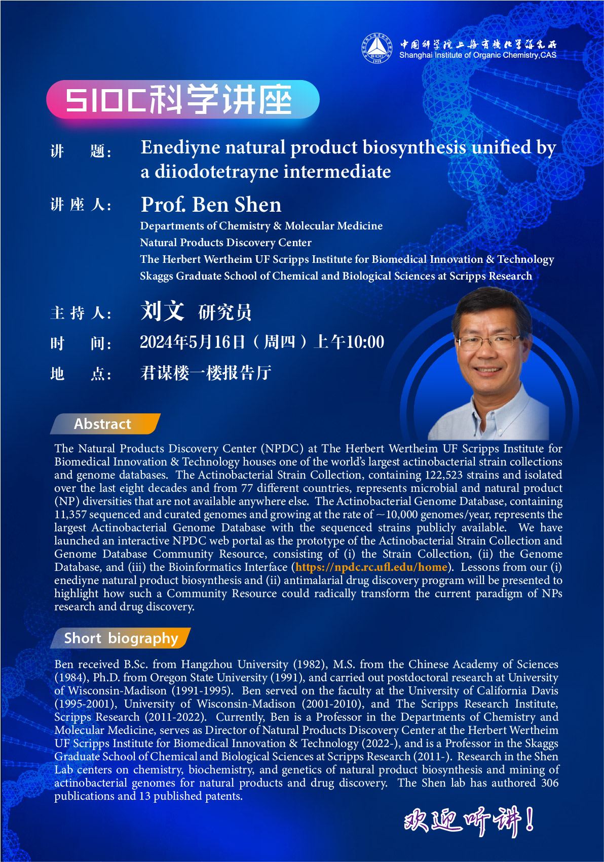 讲 题:Enediyne natural product biosynthesis unified by a diiodotetrayne intermediate