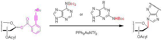 由于该反应中给体稳定、活化条件温和、没有引入亲核物种,因此,可以用酸敏感的叔丁氧羰基(Boc)这样的保护基来保护的嘌呤类碱基作为反应受体来进行N-糖苷化反应。这样,不仅克服了嘌呤在常规溶剂中的溶解性差的问题,而且完全控制了反应的区域选择性。这一合成核苷的新方法可望用于大量核苷类化合物的合成。