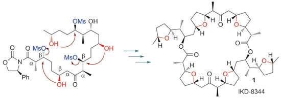 A highly efficient enantioselective total synthesis of the natural antibiotic IKD-8344 is achieved through a convergent route. This route features an otherwise impossible concurrent formation of the THF rings from a linear polyketide precursor through intramolecular O alkylations of mesylates in competition with normally rather facile β elimination and/or α racemization reactions (see scheme, Ms=methanesulfonyl).