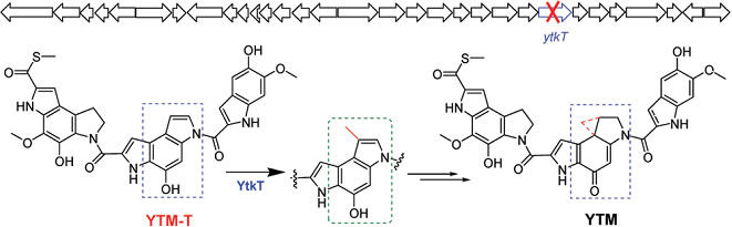 谷田霉素(Yatakemycin,YTM)可以抑制致病真菌,且对肿瘤细胞表现出极强的毒性(比抗肿瘤药物丝裂霉素的活性高约1000倍);该家族化合物属于DNA烷基化试剂,典型的结构特征是吡咯吲哚环上的环丙烷结构。为了阐明其独特的生物合成机制,该课题组利用全基因组扫描技术定位其生物合成基因簇,通过基因敲除结合生物信息学分析确定了基因簇边界。在对突变株的发酵检测中成功分离鉴定了中间体YTM-T的结构,并结合体外生化实验揭示了一类同源于粪卟啉原III-氧化酶(Coproporphyrinogen III oxidase)的甲基化酶以自由基机理催化YTM-T发生C-甲基化(J. Am. Chem. Soc., 2012, 134, 8831-8840),这是此类蛋白催化自由基甲基化反应的首例报道。这一阶段性结果为下一步阐明YTM结构中最重要的环丙烷部分生物合成途径奠定了基础。