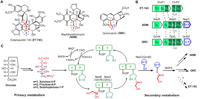 萘啶霉素(Naphthyridinomycin,NDM)、奎诺卡星(Quinocarcin,QNC)及Ecteinascidin 743 (ET-743)均属于四氢异喹啉生物碱家族化合物;它们都具有显著的抗肿瘤活性,其中ET-743已发展为第一例海洋天然产物来源的抗肿瘤新药。这三种化合物都具有一个独特的二碳单元结构,其生物合成来源问题一直没有得到解决。为了揭示这一谜团,唐功利课题组在克隆了NDM和QNC生物合成基因簇的基础上,通过前体喂养标记、体内相关基因敲除-回补,以及体外酶催化反应等多种实验手段相结合的方式阐明了二碳单元的独特生源合成机制:NapB/D及QncN/L在催化功能上均属于丙酮酸脱氢酶及转酮醇酶的复合体,它们负责催化二碳单元由酮糖转移至酰基承载蛋白(ACP)上,而后经过非核糖体蛋白合成(NRPS)途经进入到最终的化合物中。这一结果发表在《美国科学院院报》(Proc. Natl. Acad. Sci. USA, 2012, 109, 8540-8545)。这种将基础代谢中的酮糖直接转化为次级代谢所需要的二碳单元在非核糖体肽合成途经中是首次报道,该研究结果也有助于揭示海洋药物ET-743独特的二碳单元生物合成来源,为非核糖体聚肽类天然产物的组合生物合成带来新的前体单元。