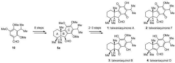 台湾杉醌 (taiwaniaquinoids) 是一类具有6,5,6-松香烷骨架结构的二萜天然产物。自其于1995年首次从台湾杉 (Taiwania cryptomeriodes Hayata) 中分离鉴定以来,台湾杉醌以其化学结构和生物活性上的特点,引起了合成化学家的密切关注。一系列对于该类天然产物的全合成和形式合成以及相关的方法学研究不断涌现。值得注意的是,大部分对台湾杉醌类天然产物的全合成研究集中于在构建顺式5-6并环体系(例如taiwaniaquinol B),其原因在于顺式5-6环系的较高的热力学稳定性。对于具有反式5-6并环体系的taiwaniaquinone A,其合成难度显著增大,因此相关报道较少。
