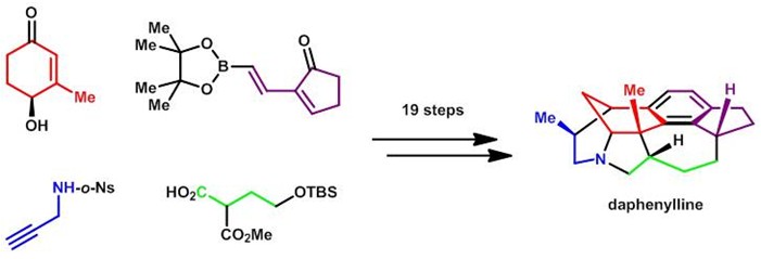虎皮楠生物碱 (Daphniphyllum alkaloid) 是一大类从虎皮楠科植物中分离得到的具有化学、生物和生物合成等多方面重要意义的天然产物。我国天然产物化学家郝小江、岳建民、郭跃伟等在该类天然产物的分离鉴定上作出了重要贡献。由于其多并环结构的复杂性和多样性,在该家族约250个成员中仅有7个分别由合成化学家Heathcock和Carreira完成了全合成。对其余结构迥异的成员的系统性全合成仍是天然产物合成领域的一大挑战。