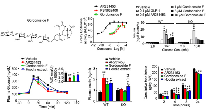 谢欣课题组研究生张书永等通过大量化合物筛选发现蝴蝶亚的孕甾糖苷化合物Gordonoside F,而不是原先报道的P57,可以特异性激活与代谢密切相关的G蛋白偶联受体GPR119。实验发现,该化合物通过激活GPR119刺激胰高血糖素样肽-1(GLP-1)和胰岛素的分泌,并抑制小鼠食欲。在GPR119敲除小鼠中,其药效消失。有意思的是,蝴蝶亚的粗提物也是部分通过激活GPR119来抑制食欲,这一结果解释了蝴蝶亚的药效机理。这类新型GPR119激动剂的发现为抗肥胖药物的开发奠定了良好基础。