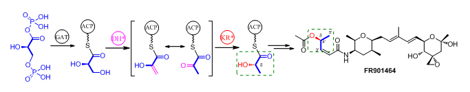 聚酮类天然产物具有复杂多样的化学结构,是目前成药比例最高的一类天然产物;其生物合成是由聚酮合酶(PKS)催化的。通常情况下,PKS以乙酰辅酶A或丙酰辅酶A为起始单元;另外,脂肪酸、莽草酸及氨基酸等的代谢中间体或衍生物也可以被PKS作为起始单元合成聚酮天然产物。然而,最近的研究表明,一些特殊的PKS可以利用甘油的衍生物作为起始三碳单元合成,包括Bryostatin、FR901464、Thailanstatin、SIA7248、Tartrolon等化合物,但其具体的生物合成途径及酶学机制一直停留在推测阶段。