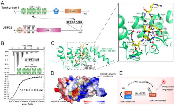 该工作首次发现在众多的癌细胞中高表达的去泛素化酶USP25是Wnt信号通路的正调节因子,能够促进癌细胞增殖和转移,并发现多聚腺苷二磷酸核糖聚合酶Tankyrase-1/2是USP25的重要底物,它们在USP25介导的去泛素化后变得更加稳定,并在蛋白质Axin上生成多聚腺苷二磷酸核糖修饰,导致Axin的降解,从而解除Axin对Wnt信号通路的抑制作用。通过进一步系统的结构生物学、生物化学和细胞生物学的机制研究,他们发现USP25通过一小段多肽与Tankyrase-1/2的ankyrin重复结构域发生直接的相互作用,破坏USP25与Tankyrase-1/2的结合,能很好地促进Tankyrase-1/2的蛋白降解,从而稳定Axin,进一步抑制Wnt信号通路。这项工作首次揭示了USP25通过调节Tankyrase和Axin的蛋白质水平来激活Wnt通路,从而促进癌细胞增殖。由于Tankyrase-1/2通过一个较深的口袋来结合USP25的一小段多肽,因此非常适合筛选结合这一位点的小分子化合物,用来抑制USP25与Tankyrase-1/2的结合,进而调控Wnt信号通路来抑制相关肿瘤细胞的生长。值得一提的是,目前一些制药公司已经开发了靶向Tankyrase-1/2催化活性的多种化合物,但都没有足够好的肿瘤抑制效果。此项工作开辟了不针对Tankyrase-1/2酶活性来开发Wnt信号通路小分子抑制剂的新机遇,为研发新类型的抗肿瘤药物提供了新的视角。