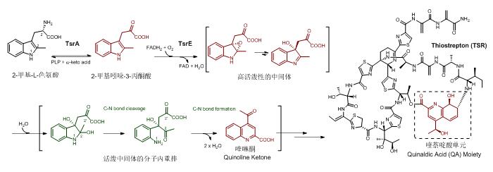 黄素依赖的加氧酶(Flavin-dependent oxygenase)是一类以黄素腺嘌呤二核苷酸或黄素单核苷酸为辅酶的氧化还原酶,在生命过程的各个阶段广泛参与各种与氧化还原相关的生化反应。近期,中国科学院上海有机化学研究所生命有机化学国家重点实验室刘文研究员课题组和金属有机国家重点实验室郭寅龙研究员课题组进行合作,以硫肽类抗生素的典型代表硫链丝菌素(Thiostrepton,TSR)为研究对象,报道了一例黄素依赖的加氧酶通过底物的立体专一性氧化来促进吲哚五元环的扩环重排,揭示了自然界中一种喹啉单元形成的酶学新机制。相关成果已于8月18日在线发表于《美国化学会志》上(J. Am. Chem. Soc. 2017, DOI: 10.1021/jacs.7b05337)