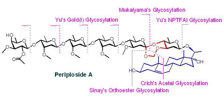 杠柳(Periploca sepium Bge.)的干燥根皮又名北五加皮或香加皮等,是祛风湿、强筋骨的传统中药。1987年,日本化学家首次从杠柳中分离鉴定了一类结构独特的孕甾糖苷化合物--杠柳苷(periploside)。随后的体内外实验发现杠柳苷具有显著的免疫抑制活性,佐证了该中药用于治疗类风湿症的功效。而杠柳苷的确切结构直到2011年才由中科院上海药物所的赵维民等通过X-射线单晶衍射得到确定,证明该类化合物具有一个独特的亚甲基缩醛桥连的七元环原酸酯结构。这一前所未见的结构模块加之连续的2-脱氧-beta-糖苷键使得对该类分子的化学合成成为极大的挑战。
