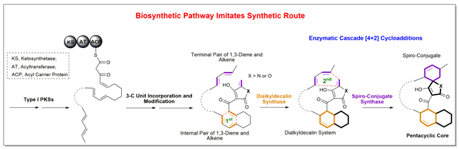 刘文团队最近的发现为回答这一科学难题创造了有利的契机。在螺环乙酰乙酸内酯/内酰胺抗感染抗生素的生物合成中,两种不同的[4+2]D-A环化酶以催化串联反应的方式,将具有两套共轭双烯与亲双烯体单元的线性中间体有效地转化为单一对映体的刚性五环骨架。与之前的例证不同,在没有相应的酶蛋白存在下,上述具有高度区域和立体选择性的[4+2]环加成反应无法自发发生,同时所依赖的酶蛋白功能单一、效率高,是非常理想的验证D-A反应生物催化机制的研究对象。