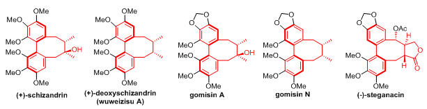 联苯环辛二烯木脂素是一类具有重要生理活性的天然产物。例如,我国传统中药五味子的主要成分五味子素(schizandrin) 和五味子甲素(deoxyschizandrin)就属于这类化合物,具有很多的药化作用,包括抗肿瘤,包肝,增进睡眠,调节代谢和免疫功能等。目前发现联苯环辛二烯木脂素多达100多个。由于其重要的生理作用和独特的手性结构特征(2个中心手性、一个轴手性),这类分子的合成一直是有机化学中的一个热点。一个高效的策略是发展一个催化不对称环化反应建立中心手性然后通过一个分子内偶联构筑轴手性。