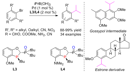 大位阻异丙基芳基结构存在于众多天然产物活性分子中。长期以来人们利用傅克酰基化或芳基金属试剂对羰基加成、甲基金属试剂对羰基加成、氢化等数步反应构筑这类结构。一个理想的方法是通过一个大位阻芳基卤代烃和异丙基硼酸间的Suzuki-Miyaura交叉偶联一步构筑。然而,现有的催化偶联体系不能提供一个高效的方法,在构筑异丙基芳基结构(Ar-iPr)的同时,还伴随着由于β-氢消除导致的还原产物(Ar-H)和异构化副产物 (Ar-nPr)。在大位阻环境下,很多催化偶联体系事实上只能提供极低收率的异丙基芳基偶联产物。
