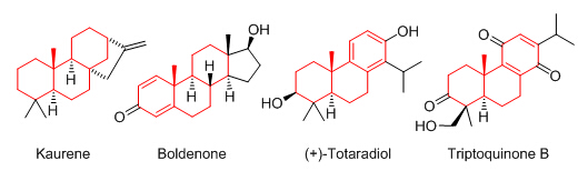 含手性季碳的三环骨架广泛存在于甾体和萜类天然产物中,而且这一类天然产物表现出丰富的生理活性。例如,贝壳杉烯 (Kaurene) 是赤霉素生物合成的前体; 同化激素宝丹酮 (Boldenone) 是一种合成代谢类固醇;陶塔二酚 (Totaradiol) 是一种抗菌性二萜类天然产物。如何高效地构建这类含手性季碳三环骨架一直是有机化学中的一个热点和挑战。过渡金属催化的不对称Heck环化反应是一种常用的高效构建含手性季碳多环骨架的方法。然而这种方法也存在局限性,有时底物中的烯烃需要多步来合成,有时Heck环化产物需要多步转化生成天然产物。