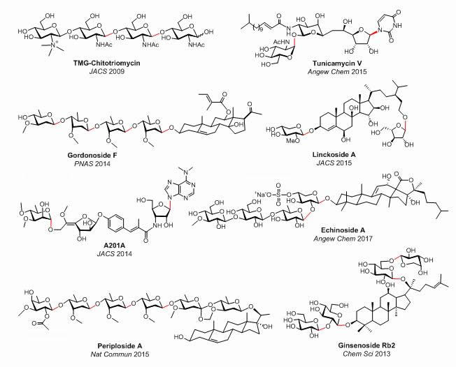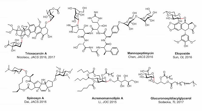 图2. 俞飚课题组应用该糖苷化反应于天然糖缀合物全合成的部分实例