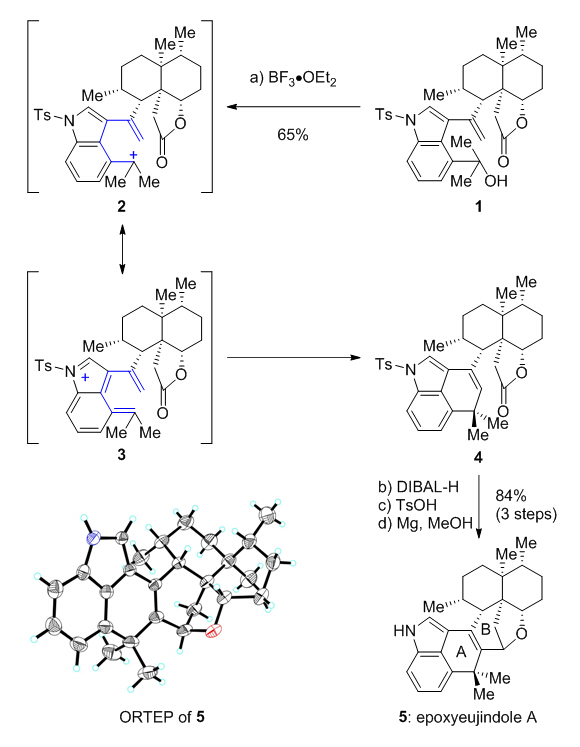 李昂课题组的研究人员陆钊洪、李海龙和卞明博士,通过极为勤奋的努力,完成了epoxyeujindole A的首次全合成 (J. Am. Chem. Soc. 2015, DOI: 10.1021/jacs.5b09198)。分子左半部分顺式十氢合奈骨架的构建借助铜催化的不对称共轭加成/烷基化;侧链的立体选择性引入依靠烯丙基碘化物参与的Nozaki-Hiyama-Kishi偶联反应;吲哚片段的连接则使用Suzuki-Miyaura偶联反应;再通过官能团修饰得到高级中间体1。整个合成的核心策略在于利用正离子类型反应的强大驱动力,利用非官能化烯烃自身的富电子特性,以最直接的方式形成空间上非常拥挤的碳-碳键。在BF3•OEt2的作用下,高度取代的A环得以顺利形成。值得注意的是,该正离子环化反应具有一定的6π电环化反应的特征:其关键中间体2可以设想为共轭三烯结构3。因此该合成从理念上与李昂课题组在daphenylline, tubingensin A, xiamycin A, oridamycins A和B, rubriflordilactone A, clostrubin等分子中反复运用的电环化策略有一定的相通之处。后期B环的形成则运用Prins环化反应高效地实现。