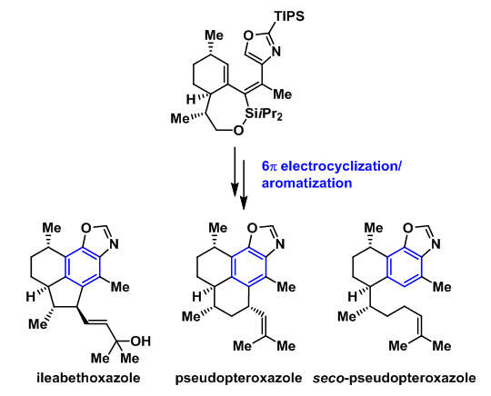 自Nicolaou开创性地运用电环化反应合成endiandric acids以来,电环化策略在天然产物全合成中开始引发关注,然而其威力一直未被充分认识。电环化反应的优点在于:1) 具有较强的热力学驱动力和较高的成键/成环效率,无需对成键位点进行预先官能化;2) 容忍多取代底物,取代基立体化学问题预先独立解决;3) 易于采取汇聚式策略构建三烯前体,提高合成的总体效率。但其在复杂分子合成中的弱点在于制备顺式共轭烯烃底物的困难。生命有机化学国家重点实验室李昂课题组着眼于6π电环化在合成多取代六元环方面的优势,将其与环己二烯的氧化芳构化相结合,发展了构建多环体系中多取代芳环的合成策略,在daphenylline, xiamycin A, oridamycins A和B, dixiamycin C, rubriflordilactone A和clostrubin等天然产物的全合成基础上,近期完成了苯并噁唑二萜ileabethoxazole, pseudopteroxazole和seco-pseudopteroxazole的全合成 (Angew. Chem. Int. Ed. DOI: 10.1002/anie.201510568)。该类分子是由Rodríguez等从加勒比海柳珊瑚中分离鉴定的,具有显著的抗结核菌活性。