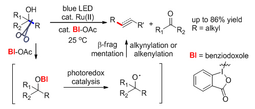 生命有机化学国家重点实验室的陈以昀课题组首次报道了通过环状高价碘对醇的活化,实现了可见光引发的温和条件下醇氧化产生烷氧自由基(J. Am. Chem. Soc. 2016, 128, 1514-1517)。该烷氧自由基通过β断裂产生烷基自由基,进一步发生炔基化和烯基化反应。该方法可以实现张力环醇和线性醇的碳碳键切断及官能化,具有优秀的区域和化学选择性,可以应用于复杂分子石胆酸及胆固醇的合成后期修饰。