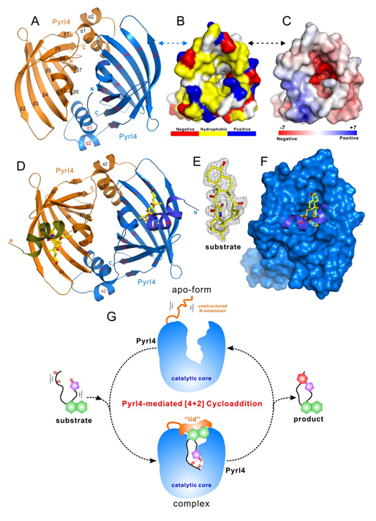 Diels-Alder(D-A)反应是一类能够直接形成C-C键的重要有机反应,可以高效地实现对于杂环、手性螺环和桥环等复杂结构的构筑,被广泛地应用于合成化学领域;近年来一些特殊的D-A反应还被开发为“点击化学”(click chemistry)和“生物正交化学”(bioorthogonal chemistry),并应用于材料科学和生命科学的研究中。通过对于天然产物生源合成途径的分析,诸多天然产物的骨架构筑过程中可能涉及到D-A反应,因此D-A反应也经常被巧妙地应用于天然产物的仿生合成研究中。一方面,随着分子前线轨道理论的发展,合成化学家开发了一系列能够促进D-A反应的小分子催化剂;另一方面,基于著名化学家鲍林的酶催化理论(生物大分子在催化过程中可以通过主-客体相互作用稳定底物小分子的反应过渡态),人工筛选、制备的能够识别底物反应过渡态的抗体酶或核酶也能够在一定程度上催化分子间的D-A反应。然而,由于缺乏直接的结构生物学和生物化学证据,天然产物的生物合成过程中所涉及到的D-A反应是否由酶催化完成以及相应的催化机制目前尚不为人知。近期,中国科学院上海有机化学研究所生命有机化学国家重点实验室刘文研究员课题组与潘李锋研究员课题组合作,在国际上首次报道了源于吡咯吲哚霉素(pyrroindomycin,PYR)生物合成途径中的D-A酶PyrI4及其结合底物小分子复合物的结构,并综合运用生物化学、蛋白质核磁共振等研究方法,系统性地阐明了以该蛋白为代表的酶促D-A反应催化机理,相关成果发表于Cell子刊Cell Chemical Biology杂志上(Cell Chem. Biol., 2016, 23, 352-360.)。