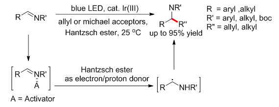 生命有机化学国家重点实验室的陈以昀课题组首次报道了可见光引发的醛酮及亚胺类化合物的极性反转分子间烯丙基化和迈克尔加成反应(Angew. Chem.Int. Ed. 2016, DOI:10.1002/anie.201607813)。反应机理研究表明还原剂汉斯酯不仅是电子和质子供体,而且还扮演了活化剂的角色,从而首次实现了可见光条件下烷基亚胺类化合物的极性反转反应。该极性反转反应在室温下进行,具有优秀的化学选择性和官能团兼容性,并且对于空气和水不敏感,为进一步发展生物相容反应提供了有利条件。