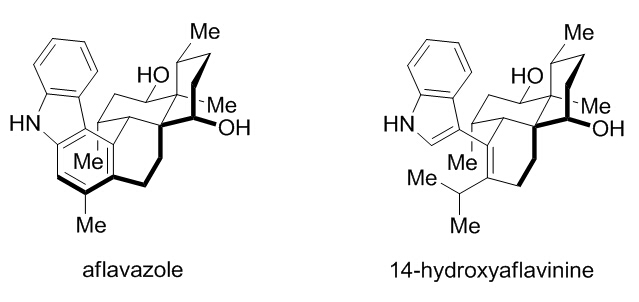 吲哚萜类天然产物是一类结构有趣、生物活性多样的天然产物。我室李昂课题组一直致力于此类化合物的全合成,并在合成研究中发展了电环化-芳构化和Prins环化等具有特色的合成策略。Anominine家族是一类空间结构拥挤的吲哚二萜天然产物,其合成引起了Danishefsky、Bonjoch和Garg等有机合成化学家的关注。李昂课题组在前期工作中实现了该家族中anominine、tubingensin A和epoxyeujindole A三个分子的全合成。