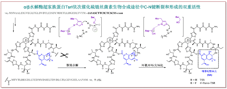 而在本研究中,他们继续沿用“前体导向突变生物合成”的策略,通过优化6-F-QA作为前体喂养突变株△tsrT后的发酵时间,他们成功分离、鉴定了一个侧环尚未关闭但QA基团已经发生环氧化的关键氟代中间体。正是由于氟原子的引入,降低了催化侧环形成的关键蛋白的酶活,从而导致了这样一个中间体的短暂积累;而继续延长发酵时间,该中间体会被转化为最终成熟的6’-fluoro-TSR分子。该中间体的分离和鉴定为TSR侧环生物合成途径中的酶学机制研究奠定了重要基础。该课题组成员通过生物信息学分析,锁定了TSR生物合成基因簇中一个功能尚未得到归属的基因tsrI,其编码的蛋白TsrI隶属于α/β水解酶超家族。综合使用基因敲除/回补、化学半合成模拟底物制备、体外酶学测活、化学喂养等手段,他们证实了TsrI是硫链丝菌素侧环生物合成过程中的关键蛋白,该蛋白同时负责了先导肽的切除和TSR侧环关闭过程的大环化反应;另外,通过序列比对、同源建模和氨基酸点突变研究,他们还在TsrI中确定了α/β水解酶超家族高度保守的“催化三联体”氨基酸残基(Asp-His-Ser)。虽然目前已有十余种α/β水解酶超家族蛋白的不同活性相继得到了报道,但是同时兼具蛋白内切酶活性和催化游离氨基进行环氧开环活性的“双功能”α/β水解酶在此前的研究中却从未被发现。本研究中关于TsrI功能的阐明,不但解决了长期以来困扰人们的双环硫肽抗生素侧环如何关闭的问题,更拓展了人们对于α/β水解酶这一超家族蛋白生化功能的进一步认识和理解,同时为基于合成生物学策略改造双大环硫肽类抗生素分子结构的研究奠定了基础。