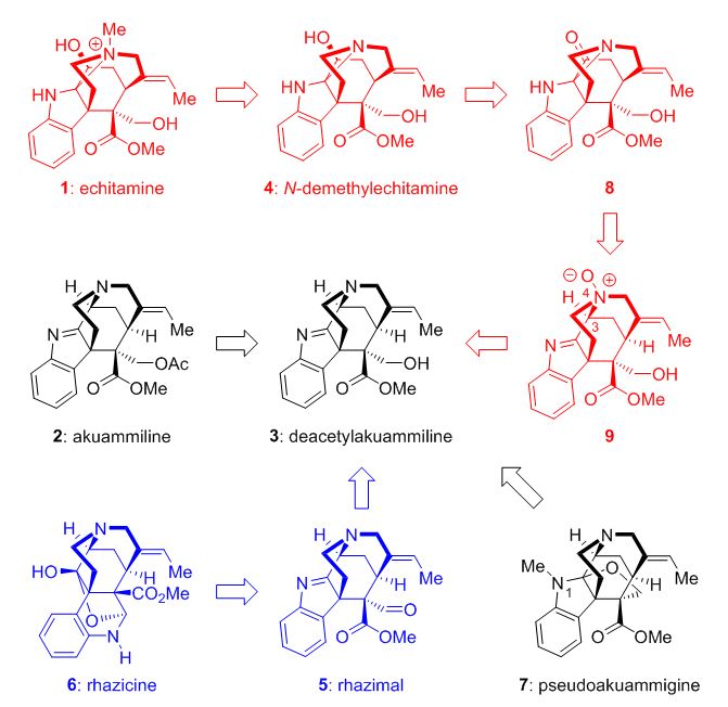 图1. 部分echitamine/akuammiline生物碱家族成员之间的合成关联