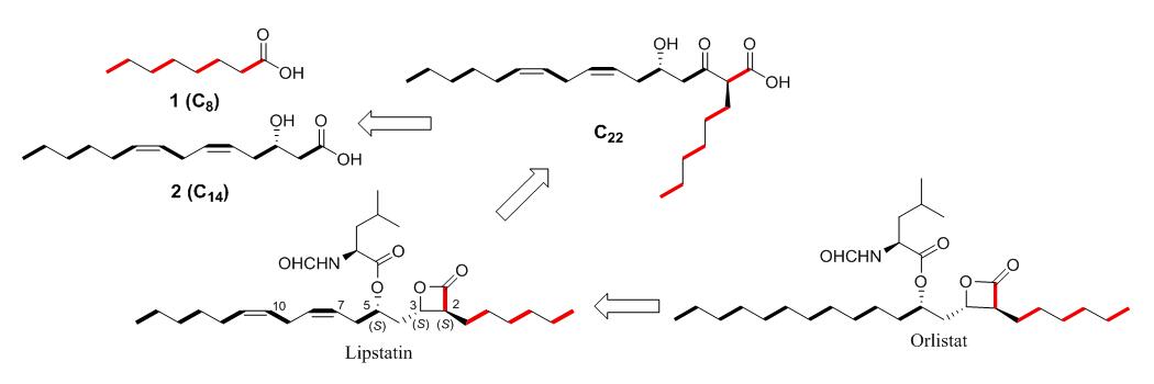 图1 Lipstatin和Orlistat转化关系以及Lipstatin的生物合成反分析。
