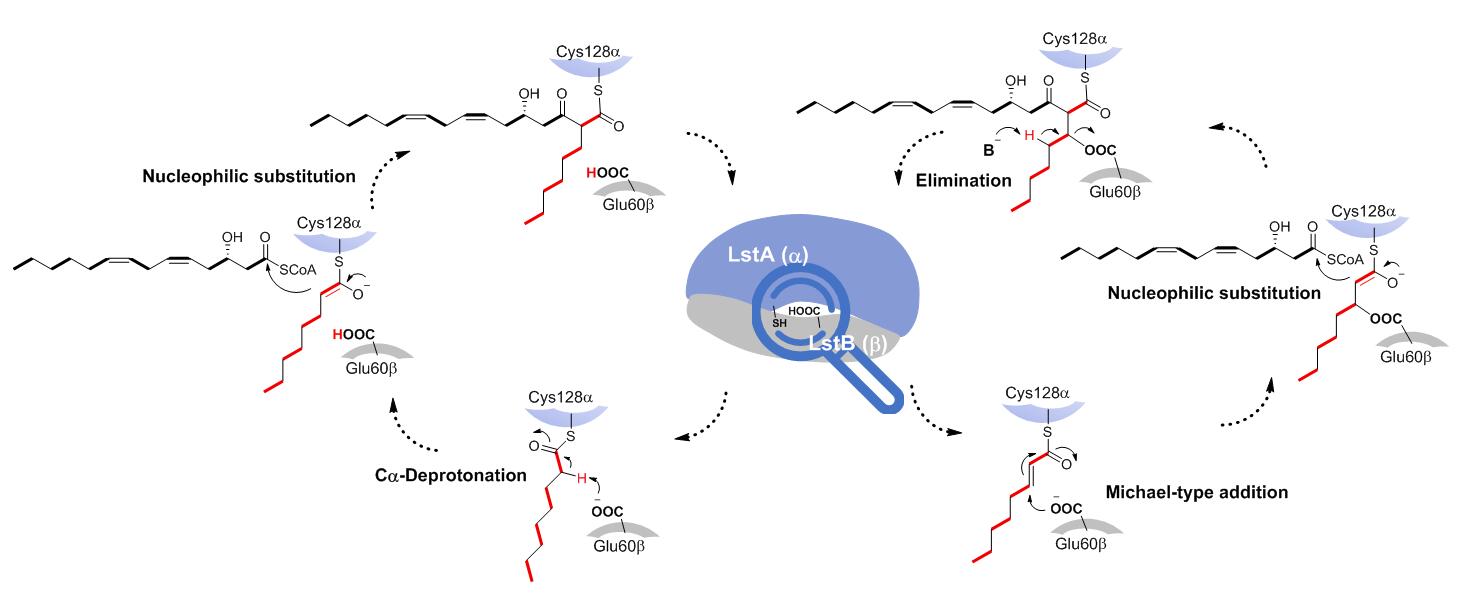 此次工作中,他们通过体外酶学实验确定了LstA,LstB和LstD在Lipstatin骨架形成中负责的功能。LstA和LstB以特殊的异源二聚体存在,并以非脱羧基式的Claisen缩合反应,协同催化底物间缩合:LstA首先使用保守的半胱氨酸(Cys128α)挂载8碳底物,而用于亲核进攻的烯醇式中间体则经LstB中保守的谷氨酸(Glu60β)催化形成;有趣的是,当使用α,β不饱和双键的8碳底物时,LstAB又催化了另外一种缩合机制,其中关键的烯醇式中间体由Glu60β引发1,4-Micheal加成反应而形成。缩合的中间产物从Cys128α上水解后,再经LstD催化还原,生成羧基更加稳定的还原产物。他们还考察了LstAB对底物的容忍性,发现SNAC、苯硫酯类的模拟底物以及饱和脂肪链和一些双键位移的类似物都能被LstAB接受。KAS-III和它所属的硫解酶超家族蛋白多以同源二聚体的方式催化反应。LstAB新颖催化机制的解析也让人重新审视硫解酶超家族蛋白的功能机制。LstAB的同源蛋白广泛地存在于链霉菌,诺卡氏菌和分枝杆菌等的菌属中,而其负责合成化合物的结构和功能仍待后续揭示。