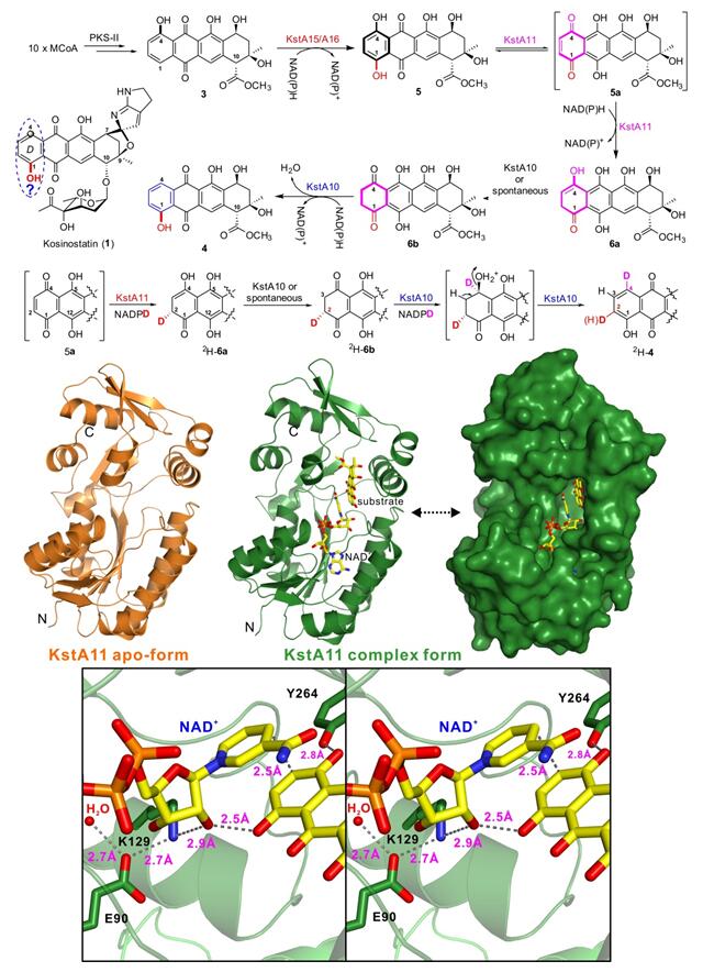芳香聚酮类化合物是自然界广泛存在的天然产物,其中蒽环类化合物作为广泛应用的抗癌药物之一,得到基础研究和临床研究的广泛关注。但该类化合物一直存在心脏毒性等副作用,因此迫切需要开发新的蒽环类药物来满足临床需求。唐功利研究员课题组长期以来致力于微生物来源、结构复杂的抗肿瘤天然产物的生物合成及组合生物合成研究。越野他汀(Kosinostatin,KST,1)是由海洋小单孢菌产生的、具有独特螺环结构的蒽环天然产物,具有显著的抗肿瘤活性。在前期的工作中,他们克隆了KST完整的生物合成基因簇,并通过体外生化实验证实了独立的NRPS的腺苷化蛋白A能识别、活化烟酸,并上载到酰基载体蛋白PCP上,再经过类似色氨酸生物合成途径合成氮杂双环。基于鉴定的不含氮杂双环的1-OH蒽环中间体,揭示了由NRPS和系列后修饰合成氮杂双环模块的新途径;同时提出了该模块与II型PKS及后修饰合成的1-OH蒽环中间体经螺环偶联、再经过糖基化生成KST的汇聚式生物合成模式(Chem. Biol. 2013, 20, 796-805)。之后的研究表明该PKS-II催化合成的是典型的4-OH蒽环中间体,而和氮杂双环偶联的必须是1-OH蒽环中间体,由此推测KST的生物合成途径中包含了一个蒽环上C-4到C-1的羟基位置异构反应。