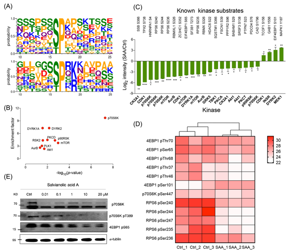 蛋白磷酸化是一个十分重要的蛋白质的翻译后修饰,细胞通过蛋白质磷酸化来调节和控制蛋白质活性、定位和功能。考虑到mTORC1具有激酶的活性,他们用磷酸化蛋白组学分析了SAA对整个细胞信号通路的扰动情况。结果显示SAA处理细胞后导致171 个蛋白的磷酸化水平显著下调(fold change < -3, p value < 0.05),81个蛋白的磷酸化水平被显著上调(fold change > 3, p value < 0.05)。KEGG分析表明这些磷酸化蛋白主要富集在调控细胞生长和增殖的PI3K-Akt-mTOR信号通路轴上。进一步的激酶底物富集分析(KSEA)也得到相同的结果。因此,从磷酸化蛋白组学层面上,可以证明SAA对mTORC1激酶活性的抑制作用非常明确。