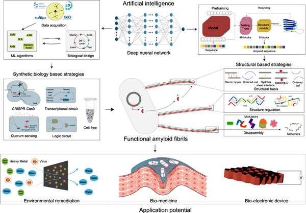 综述首先讨论了淀粉样聚集体的基本结构特征。进一步探讨了两种主要的功能性淀粉样纤维聚集体设计策略的基本原则:1)通过蛋白质模块设计或混合,引入新功能,这类应用包括催化、病毒清除、生物模拟矿化、生物成像和生物治疗等;2)利用合成基因回路动态调控生物体内的淀粉样纤维聚集体,主要应用在形状生成、泄漏修复和压力感测等方面。随后,文章总结了结构生物学技术的突破如何揭示淀粉样纤维聚集体在原子级别的结构多样性,并阐述了淀粉样纤维聚集体的组装和解聚是如何被各种因素精确和多级调控的。这些精准的结构知识对于指导淀粉样纤维聚集体的理性设计,特别是设计具有多种生物活性和可调控属性的淀粉样纤维聚集体,具有重要的意义。最后,文章展望了整合结构可调性、合成生物学和人工智能可能带来的功能性淀粉样纤维聚集体设计新趋势。