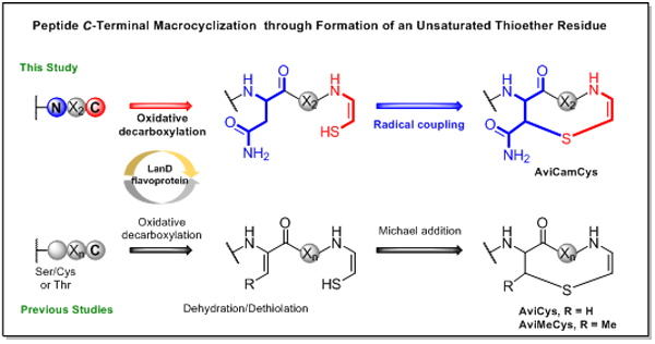 烯基硫醚环肽是一类包含不饱和硫醚键特征结构的核糖体环肽。在所有已阐明的生物合成途径中,该结构片段都来源于前体肽中羧基端的烯基硫醇与上游脱氢氨基酸之间的反应,二者通过迈克尔加成形成一个被称作2-氨基乙烯基(甲基)半胱氨酸的非天然氨基酸(Avi(Me)Cys)。脱氢氨基酸可由丝氨酸、苏氨酸脱水或半胱氨酸脱硫形成,产生方式相对可变;而烯基硫醇的形成过程则非常保守,均由LanD黄素蛋白催化前体肽末端半胱氨酸氧化脱羧形成。前期的研究表明,产生的烯基硫醇物种反应性很强,如果没有上游的脱氢氨基酸作为亲核加成的对象,很容易在水相环境中转化降解。除了迈克尔加成反应以外,自然是否存在其它翻译后修饰化学,能够利用活泼的烯基硫醇物种产生不同于Avi(Me)Cys的不饱和硫醚环结构呢?
