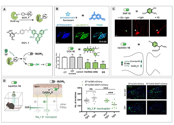在上述工作基础上,陈以昀课题组设计合成了双功能配体-有机染料小分子BGFL,在活细胞内与SNAP-tag蛋白偶联,得到可遗传编码的杂合蛋白光催化剂SNAP-FL。该蛋白光催化剂SNAP-FL具有优秀的光催化性质与光化学稳定性,可以在体外及体内高效快速生成超氧自由基阴离子,促进脱硼羟基化反应释放生物活性小分子(图2A)。基于该杂合蛋白光催化剂的可遗传编码性,该技术在线粒体、细胞核、内质网及细胞质等亚细胞器均可实现空间特异性的光催化释放抗癌药物阿霉素,从而实现了亚细胞特异性的光调控蛋白质功能(图2B)。上述光催化小分子调控方法在离体神经元中,通过光催化释放线粒体解偶联剂DNP,实现了线粒体膜电位的靶向调控,并且与光遗传学联用实现了神经投射突触前GABA(B)受体的特异性光激活(图2C)。最终,通过绿光照射活体小鼠皮肤,首次实现了光催化释放巴氯芬有效缓解瘙痒,揭示了NaV1.8+神经元是巴氯芬抑制痒觉传导的关键作用细胞类型(图2D)。