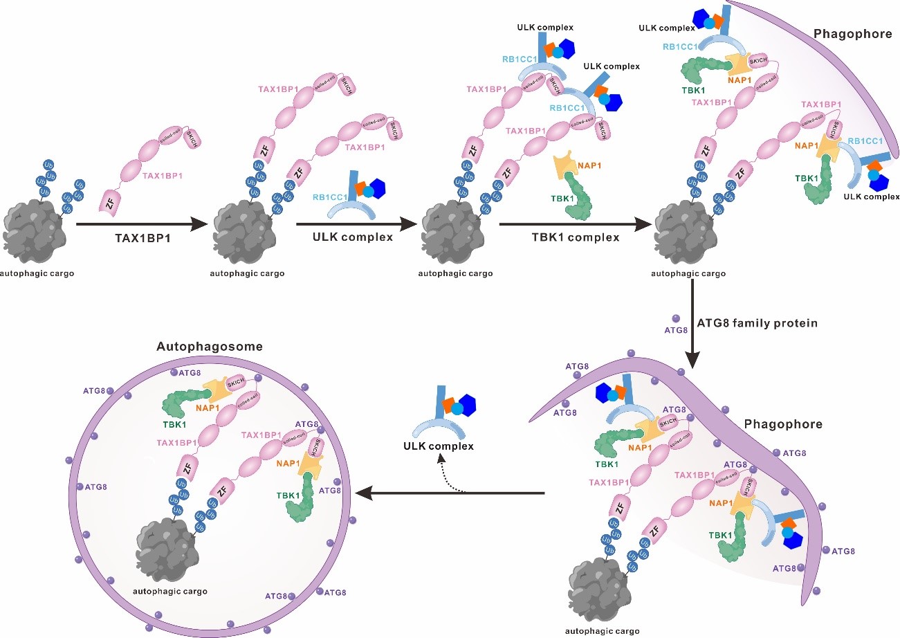 图2.TAX1BP1在选择性自噬过程中招募ULK、TBK1复合物以及ATG8家族蛋白的工作模式图