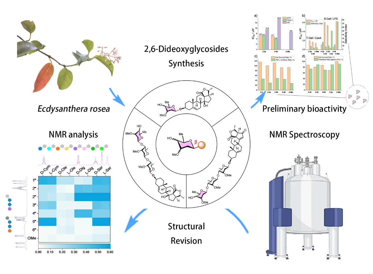 为了确证天然分子的结构,团队合成了对应ecdysantheroside A的所有可能的八个2,6-二脱氧糖苷立体异构体。通过核磁数据的比对,将ecdysantheroside A的报道结构从d-磁麻糖苷修正为d-齐墩果糖苷。进一步通过核磁数据分析和全合成,解析了三糖苷ecdysosides B和F的真实结构,确证其末端糖基分别为d-齐墩果糖和d-迪吉糖。